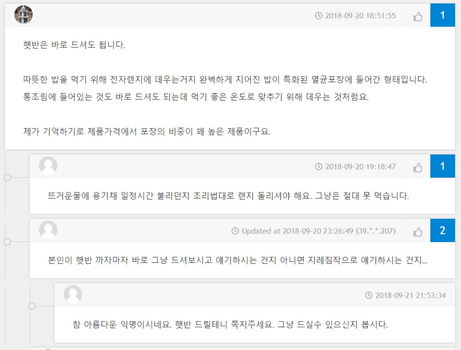 위에 보면 어느 커뮤니티에서 햇반을 그대로 먹을 수 있다는 말에 그대로 못 먹는다는 대댓글들을 볼 수 있다. 햇반이라는 특정 상품을 갖고 말해서 그렇지 다르게 말하면 찬밥이나 식은 밥은 절대로 못 먹는다는 것과 다르지 않는데 대댓글로 못 먹는다고 한 사람들이 크게 착각하고 있다.